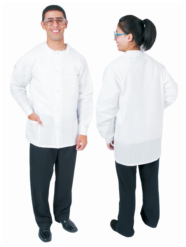 Tested Level 2 Barrier (AAMI PB70) and resistant to blood splash, bleach and all aqueous liquids. Withstands hot water (160°F) wash to sanitize lab jackets without need for bleach. Designed for more than 200 commercial washes—rated for low cost per wash.Unisex jacket with round neck/no collar, 31.5 in. (80cm) lengthRaglan sleeves for comfortable shoulder fitBreathable fabric for comfort, “lightback” material on back comparable to polyester/cottonStain-resistant, antistatic fabricLint-free to prevent sample contaminationStainless snap closures, lifetime guaranteeThree pockets, double-stitched and bar-tack reinforcedTapered sleeves, spun-woven cuffs for over-glovingOrder InfoColors: white, royal and black. Sizes available: XS to 5XL.