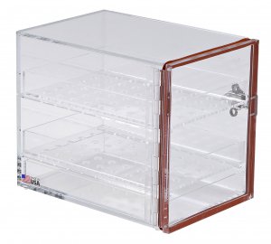 Desiccator cabinets for dry, dust-free storage at temperatures up to 120°F for use in incubators, freezers, refrigerators, or at room temperature. Made in the USA, these desiccator cabinets have air-tight doors that need no lubrication. Sliding perforated shelves for easy access; transparent acrylic walls, for see-thru storage. A third bottom shelf accommodates desiccants.