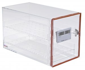 Desiccator cabinets for dry, dust-free storage at temperatures up to 120°F for use in incubators, freezers, refrigerators, or at room temperature. Made in the USA, these desiccator cabinets have air-tight doors that need no lubrication. Sliding perforated shelves for easy access; transparent acrylic walls, for see-thru storage. A third bottom shelf accommodates desiccants.