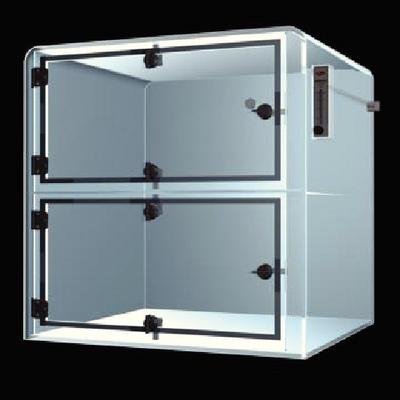 Clear acrylic desiccator dry box^ For storage of humidity sensitive parts. Configuration: 3 doors, 3 chambers, 1 tier. Overall size: 18wx16dx27h inches.