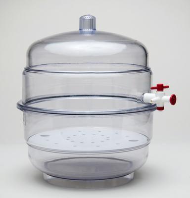 SCIENCEWARE* Space Saver Vacuum Desiccator^ Holds vacuum of 740mm of Hg for 24 hrs. Lightweight. Seal unaffected by cold (0[degree]C). Vacuum retention valve. Transparent polycarbonate bottom and cover. Neoprene O-ring flange. Takes 230mm plate. ID: 240mm. Flange OD: 273mm. Height: 311mm.