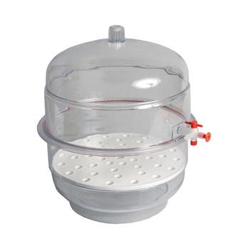 These autoclavable desiccators are made of polypropylene (PP) and polycarbonate (PC) and can hold a vacuum up to 740mm Hg for 24 hours without any greasing. Autoclavable at 120°C for 15 minutes.The top dome, molded in rigid and transparent PC, gives a crystal-clear view of the sample. The knurled knob on the top provides easy handling of the dome.The transparent PC bottom provides increased viewing clarity. An internal groove on the flange holds the silicon rubber O-ring.The PP stopcock has a self-lubricating PTFE plug. The three-way plug opens to create a vacuum, closes to hold a vacuum, and opens again to release a vacuum.