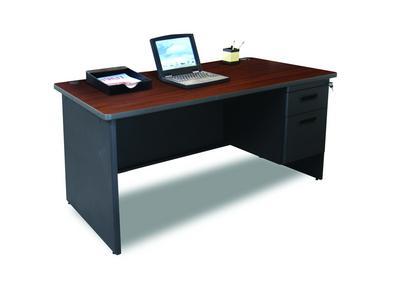 The Marvel Pronto 60 Inch^ Single pedestal desk features one hanging pedestal. a textured dark neutral finish which is one of the most durable high quality finishes available. all products are made in the usa and greenguard certified.