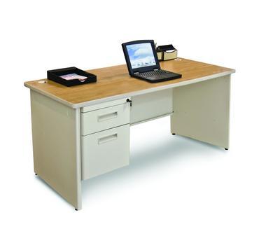 The Marvel Pronto 60 Inch^ Single pedestal desk features one hanging pedestal. a textured dark neutral finish which is one of the most durable high quality finishes available. all products are made in the usa and greenguard certified.
