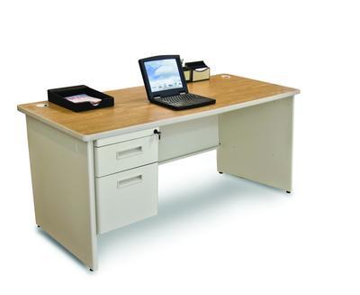 The Marvel Pronto 66 Inch^ Single pedestal desk features one hanging pedestal. a textured dark neutral finish which is one of the most durable high quality finishes available. all products are made in the usa and greenguard certified.