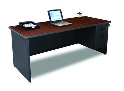 The Marvel Pronto 72 Inch^ Single pedestal desk features one hanging pedestal. a textured dark neutral finish which is one of the most durable high quality finishes available. all products are made in the usa and greenguard certified.