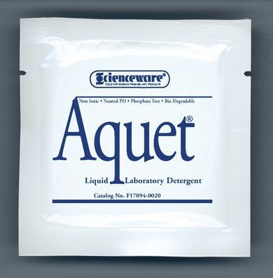 Aquet* Detergent^ Liquid detergent with neutral pH. Gentle detergent for hand washing glass and plastic labware. Biodegradable polyglycol ether will not etch or mar precision glassware. Rapidly drains and dries quickly without wiping. 20 ml pouch makes one gallon. 20 pouches per box.