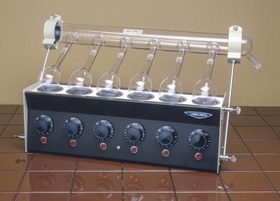 Micro Kjeldahl Digestor Unit, 6-Place^ Holds six 30 or 100ml flasks. Each station consists of a 200W tubular heater and stainless steel cup. Each heater is operated by an infinite heat control, with input from 20-100% of capacity. For 230V, 6A. Includes glass manifold and six 100ml flasks.