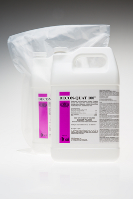 DECON-QUAT* Quaternary Ammonium Solution^ Disinfectant, food/non-food contact sanitizer. For Pseudomonas aeruginosa, Staphylococcus aureus, Salmonella choleraesuis. Prefiltered to 0.2u, gamma irradiated, double-bagged. Lot-specific Certificates of Irradiation and Analysis, Sterility Report. 3.78L.