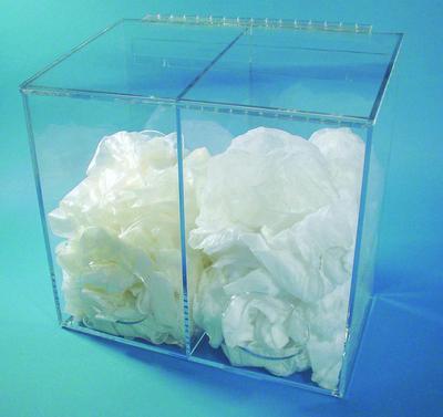 EXTRA LARGE 2 COMPARTMENT DISPENSER^ WITH FRONT ACCESS. MOUNTS TO WALL OR FREE-STANDING. CLEAR 1/4IN PETG MATERIAL