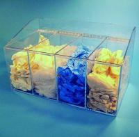 Dispenser With 3 Compartments^ 1/4 in clear petg material-safe with ipa. separate lids-no front access. multiple uses-gloves, bouffants,etc. mounts to wall or free-standing. 1 per case