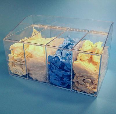 Dispenser With 4 Compartments^ 1/4 in clear petg material-safe with ipa. separate lids-no front access. multiple uses-gloves, bouffants, etc. mounts to wall or free-standing. 1 per case