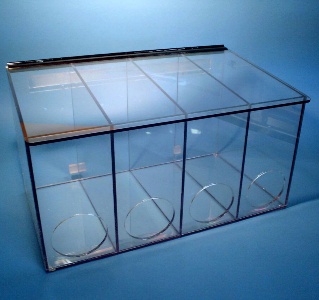 Dispenser With 4 Compartments^ 1/4 in clear petg material-safe with ipa. single lid-with front access. multiple uses-gloves, bouffants, etc. mounts to wall or free-standing. 1 per case