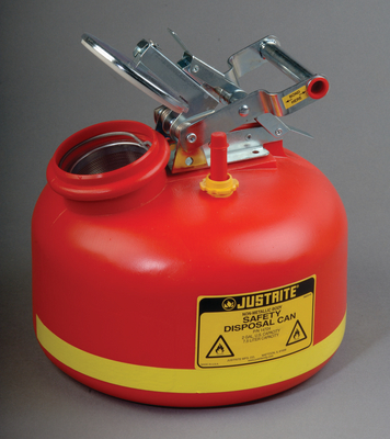 Safety Can for Liquid Disposal^ Safety Can for Liquid Disposal, Material: HDPE, with Stainless steel hardware, built-in fill guage no. 08530, Material: Polyethylene, Colour: Red, Dimension Exterior: 14.75in H x 12in OD, Capacity: 2 gal (7.5L), Fill/Pour Hole: 1.45in, Vent: 3 and 5 psig