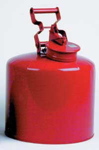 Safety Disposal Can^ Galvanized steel. Red-colored body. 18.9L capacity. 10cm opening permits easy filling and emptying. Spout cap can be locked open. Cap assembly opens automatically to relieve excessive vapor pressure. Flame arrester included. Free-swinging handle. FM approved.