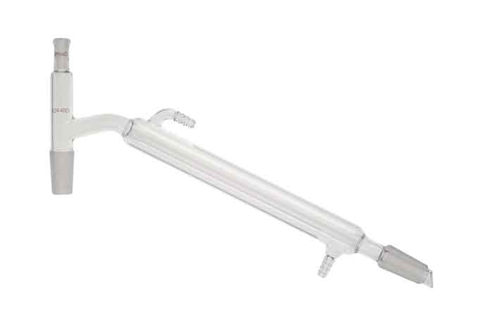 Simple take-off unit with a condenser sealed to the adapter at a 75° angle, With bottom and side Standard Taper inner drip joints, Standard Taper 10/30 outer joint on top accepts a 75 mm immersion thermometer, Hose connections are designed to fit 3/8” ID flexible tubing, Manufactured from 33 expansion, low extractable borosilicate glass conforming to USP Type I and ASTM E438, Type I, Class A requirements