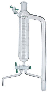 DISTILLATION RECEIVER, SOLVENT RECOVERY, GRADUATED^ 500ml. HxW: 465x230mm. Joint size: 24/40. Subdivisions: 5.0ml. Graduated distillation receiver with a 4mm three way stopcock to permit solvent removal through the 10mm O.D. tube or return to distillation flask.
