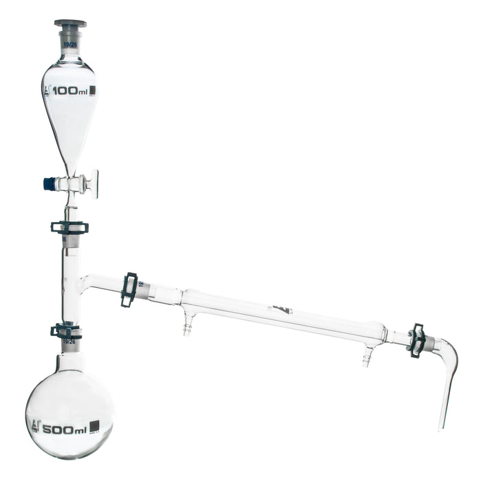 This distilling kit is made of high quality borosilicate glass. The kit consists of only the glassware for distilling experiments. No tubing or heat source or stands are included. All joint sizes are 19/26.