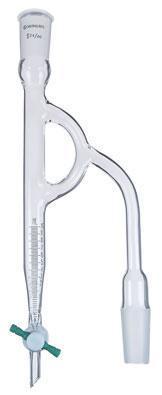 DISTILLING RECEIVER, MOISTURE TEST, MERLIC^ fluoropolymer resin Stopcock. 10ml. HxW: 275x75mm. Joint size: 14/20. Modified Dean Stark trap allows for more efficient cooling and separation of the azeotrope during distillation. Graduated from 0 to 10ml in 0.1ml subdivisions.