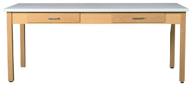 A larger model of the plain pedestal table. Designed to be large enough for multiple users to work on projects. The base is constructed of two tapered solid maple pedestal style panel legs and two solid maple truss bars.
