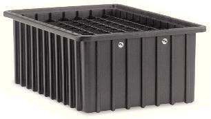 Conductive Divider Box^ Permanently conductive. Made of a carbon-filled, injection-molded polypropylene copolymer resin. Feature a strong stacking ridge, ribbed walls, and two cardholder snaps. Color: black. Load capacity: 18.1kg per container. Dimensions: 27.7Wx41.9Lx17.8Hcm.