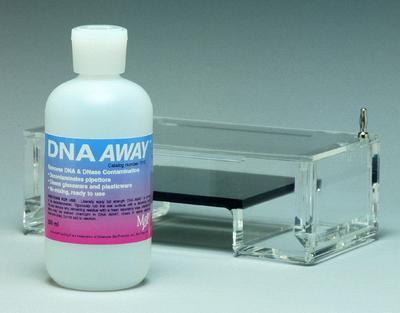 DNA AWAY*^ Squeeze bottle. 250mL. Quickly removes unwanted DNA or DNase contamination from laboratory glassware, plastics, stainless steel, and more. Ideal for cleaning non-autoclavable labware. Non abrasive and non-biohazardous. Should not be used as a reagent.