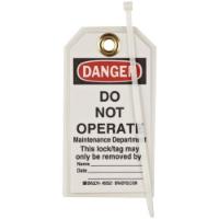 Do Not Operate Tag^ Heavy-duty polyester, completely encapsulated graphics that withstand moisture, grease, chemicals. Accepts pencil, pen and marker. Holds up to 80 lbs of pull force, preventing accidental removal. 3/8 diameter brass grommet accepts most padlock shackles. 5 1/2H x 3.