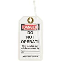 Do Not Operate Tag^ Heavy-duty polyester, completely encapsulated graphics that withstand moisture, grease, chemicals. Accepts pencil, pen and marker. Holds up to 80 lbs of pull force, preventing accidental removal. 3/8 diameter brass grommet accepts most padlock shackles. 5 1/2H x 3.