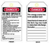 Do Not Operate Tag^ Heavy-duty polyester, completely encapsulated graphics that withstand moisture, grease, chemicals. Accepts pencil, pen and marker. Holds up to 80 lbs of pull force, preventing accidental removal. 3/8 diameter brass grommet accepts most padlock shackles. 5 1/2H x 3.