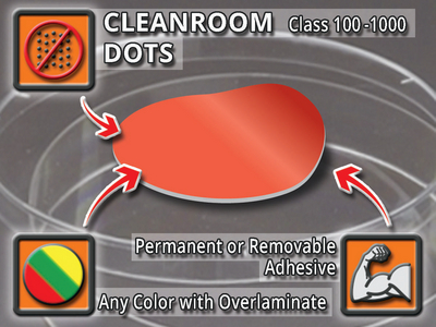 CleanMark* Thermal Transfer Dot Labels^ Red. Label diameter: 1.3cm. Made from 100% synthetic, non-particulating, ultra low-outgassing raw materials. Permanent adhesive. Mounted on 100% synthetic clear liners. Vacuum-sealed in double layers of MDPE certified, cleanroom bags. 1000 labels/roll.