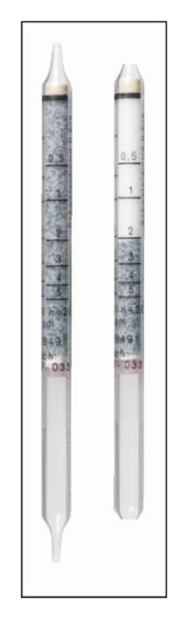 Glass detector tubes are filled with an inert reagent carrier material (silica gel, aluminum oxide, or aluminum silicate) impregnated with an indicating reagent. Reagent produces a colorimetric indication in the presence of a particular gas, vapor, or aerosol. Concentrations can be read directly from the color change on the tube's printed scale. Tubes are hermetically sealed. Most have a two-year shelf life (when stored at room temperature). Available in packs of ten.Note: Some tests require a pretube or comparison tube in addition to the detector tube. These tubes are included in the box of 10, thus reducing the number of detector tubes. The actual number of detector tubes is cited in the ordering charts.Order InfoExtension of measuring range listed is possible for some detector tubes. Call Fisher Scientific™ at 1-800-772-6733 for more information.