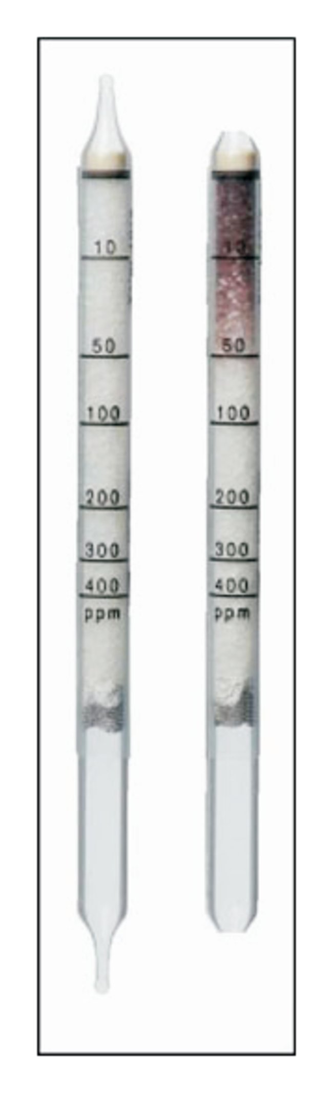 Glass detector tubes are filled with an inert reagent carrier material (silica gel, aluminum oxide, or aluminum silicate) impregnated with an indicating reagent. Reagent produces a colorimetric indication in the presence of a particular gas, vapor, or aerosol. Concentrations can be read directly from the color change on the tube's printed scale. Tubes are hermetically sealed. Most have a two-year shelf life (when stored at room temperature). Available in packs of ten.Note: Some tests require a pretube or comparison tube in addition to the detector tube. These tubes are included in the box of 10, thus reducing the number of detector tubes. The actual number of detector tubes is cited in the ordering charts.Order InfoExtension of measuring range listed is possible for some detector tubes. Call Fisher Scientific™ at 1-800-772-6733 for more information.