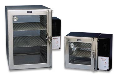 Durable, hand crafted construction. Fabricated from stainless steel and glass, Superior seal integrity, Rigid door full length door hinges, One piece neoprene door gasket, Shelves are adjustable in half-inch increments, Two different sizes to select from, Automatically regenerates the silica gel desiccant enclosed in the control unit eliminating the need to replace or bake desiccant, Easy to read door mounted hygromete