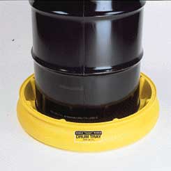 Drum Tray^ Tray with reservoir keeps container away from spills. Ideal for use under drums during dispensing or filling operations. Holds 34L when used with a 208L drum. Constructed of high-density polyethylene.