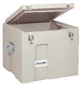 Compact Dry Ice Chest^ Volume: 0.05m3. Inner: 38.1Dx35.6Wx38.7Hcm. Outer: 46.4Dx42.7Wx47.6Hcm. Holds up to 9.8kg of dry ice for 6 days. Low temperature plastic foam insulation. Has a polyethylene case with 5.1cm inner insulation wall of expanded foam plastic, 2 latches, and 2 spring-loaded handles.
