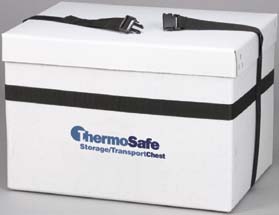 ThermoSafe* Durable Economy Chest^ Offers temperature protection. One-piece, seamless, molded polystyrene foam surrounded by a 124.7kg test laminated fiberboard container. Volume: 16L. Dry ice capacity: 15kg. Interior: 30Lx25.4Wx22.5Hcm. Wall thickness: 3.8cm. Weight: 1.8kg.