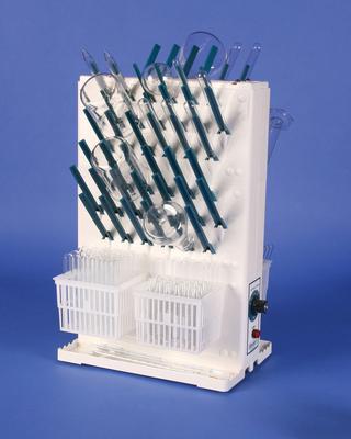 Lab-Aire II* Glassware Dryer^ Gently dries delicate labware. Three tiered, double sided. Includes wo removable test tube baskets and drip tray. White ABS with 76 contrasting blue pegs.