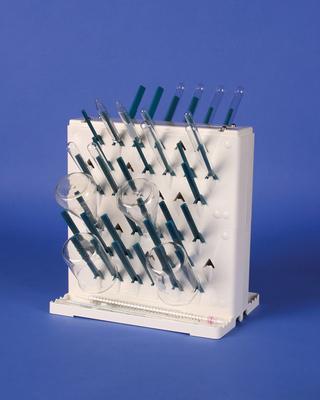 Glassware Drying Rack^ Benchtop, two tiered, double sided drying rack. Use for safely drying and storing frequently used or delicate glassware. Includes 3 sizes and lengths of rugged V-channel pegs that can be repositioned and drip tray with scalloped wells to hold burettes and pipettes.