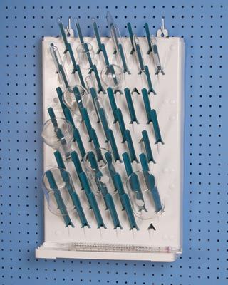 Glassware Drying Rack^ Two tiered wallmount drying rack. Use for safely drying and storing frequently used or delicate glassware. Includes 3 sizes and lengths of rugged V-channel pegs that can be repositioned and drip tray with scalloped wells to hold burettes and pipettes.