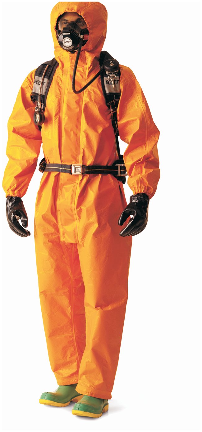 Coveralls combine the chemical protection of DuPont Tychem with the flame and arc flash protection of DuPont Nomex™ into a single garment. The fabric delivers permeation protection against a broad range of toxic industrial chemicals and even chemical warfare agents.Provide at least eights hours barrier to 20 of the 21 chemicals found in ASTM™ F1001Attached respirator-fit hood with drawstringZipper front with Velcro™ fastener double storm flaps fastened by flame-resistant treated polyamide hook-and-loop materialElastic at the wrists and anklesAttached socks and boot flapsAvailable in high-contrast orange or low-visibility graySpecificationsArc rating:15.2 cal/cm2†Thickness: 34milBasis Weight: 841 oz./yd.2Ball Burst: 167 lbfTear Resistance–Trap Tear (MD/CD): 25/32 lbfBreaking Strength–Grab (MD/CD): 155/170 lbfWearing Apparel Flammability: Class 1† For electric arc hazard exposures, wear the proper arc rated garment system as dictated by an electric arc hazard analysis.