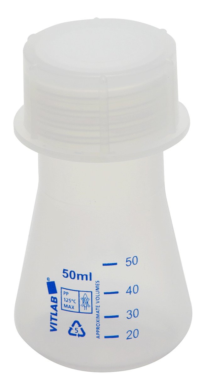 Translucent, wide-mouth, conical flasks with polypropylene screw closures. Autoclavable with excellent chemical resistance. NOTE: Before autoclaving, set closure on top of flask without engaging the threads to prevent accidental implosion. Flasks can also take stoppers.