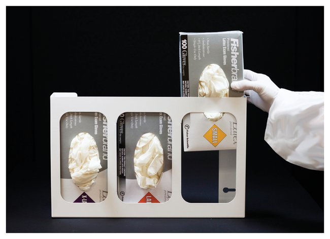 Steel dispensers feature a rust-resistant, white powder-coated finish with individual slots for quick replacement of empty glove boxes.
