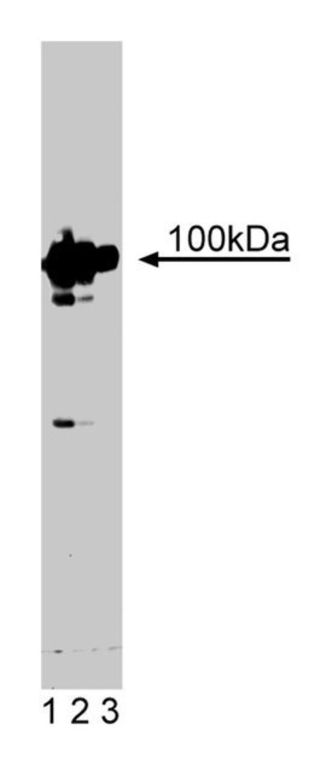 Dynamin is a nerve terminal phosphoprotein with intrinsic GTPase activity which plays an important role in endocytosis. This GTPase activity is stimulated in vitro by microtubules, SH3 domain-containing proteins, phospholipids, and Protein Kinase C (PKC)-mediated phosphorylation. There are at least two distinct dynamin genes in mammals, which show 79% identity, encoding proteins Dynamin I and Dynamin II. Dynamin I is expressed almost exclusively in the central nervous system while Dynamin II expression is ubiquitous. Depolarization stimulates synaptic vesicle recycling and Dynamin I is subsequently dephosphorylated. This rapid dephosphorylation is mediated by calcineurin which acts as a switch for depolarization-initiated synaptic vesicle endocytosis. The C-terminus of dynamin contains two clusters of proline-rich SH3 domain binding proline motifs which interact with known SH3 domain proteins during tyrosine kinase receptor activation. It is reported that clone 41 detects both dynamin I and dynamin II.