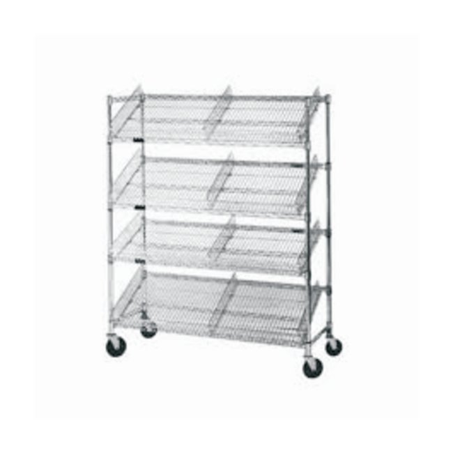 Open-wire, angled shelves combine improved ergonomics with increased visibility and flexibilityFour durable chrome shelves may be adjusted, and their angle varied, in 1 in. (2.5cm) increments, to accommodate unusual configurations. Two of the four swivel casters have brakes, and each has a weight capacity of 200 lb. (91kg), ensuring reliable mobility even with a heavy load. Measures 62 7/8 in. high (159cm) and 18 in. (46cm) long. Available with shelf widths of 36 or 48 in. (91 or 122cm).