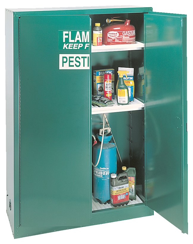 Steel constuction with lead-free high-gloss polyester-hybrid baked on finish Shelves adjust on 4.75 in. centers and support up to 350 lb.Internal and external welded steel double-wall panel construction with 1.5 in. air space Features leveling legs, 2 in. raised leakproof sill, 2 in. vent with fire baffle and cap, and ground connection Three-point key lock doors in manual and self-closing stylesLarge “FLAMMABLE - KEEP FIRE AWAY” and “PESTICIDES” labelTwelve-gallon cabinets have one door, all other sizes have two doors.ComplianceMeet NFPA code 30 and OSHA requirments. Cabinets with self-closing doors meet Uniform Fire Code and NFPA Code One requirements. Thirty-gallon and larger cabinets are FM approved.