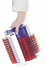 Color-coded racks optimize sample organization and identification.Increase workspace and efficiently transport large quantity of Petri dishesAvailable in 4 colors and two sizes; the 24.1cm (9.5 in.) high size holds forty-eight 100mm Petri dishes, and the 36.8cm (14.5 in.) high size holds eighty-four 100mm Petri dishesSilicone holding strips grip each Petri dish; easily insert and remove groups of dishes without disturbing upper or lower dishesSide labels provide space for critical sample identificationLightweight, chemical resistant polycarbonateAutoclavable at 121°C (250°F)