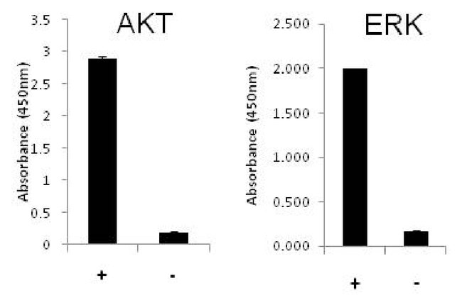 The InstantOne™ ELISA is specifically engineered for accurate measurement of phosphorylated human, mouse, and hamster ERK 1/2 and AKT 1/2/3 in cell lysates. Detection of rat ERK 1/2 and AKT 1/2/3 is also expected. The InstantOne™ ELISA kit allows for fast analysis of samples in approximately one hour. All reagents used in a traditional sandwich ELISA are added in solution to a plate followed by a wash step and detection with the TMB colorimetric substrate.Extracellular signal-regulated kinase (ERK) is the founding member and a key component of the classical Mitogen-Activated Protein Kinase (MAPK) pathway. ERK1 (p44, MAPK3) and ERK2 (p42, MAPK2) are both activated via the MAPK/ERK pathway, which is downstream of various Receptor Tyrosine Kinases (RTKs) or GPCRs. MEK, a Ser/Thr and Tyr kinase, activates ERK by phosphorylation of its TxY motifs, namely Thr202/Tyr204 and Thr185/Tyr187 of ERK1 and ERK2, respectively. Once activated, ERK phosphorylates a variety of proteins that regulate cellular processes such as cell division, proliferation, survival, differentiation, apoptosis, motility, and metabolism. AKT, which exists as multiple isoforms, is one of the principle kinases activated by phosphoinositide 3-kinase (PI3K). Activation of PI3K results in the generation of phosphatidylinositol (3,4,5)-triphosphate (PIP3). These lipid second messengers bind to the pleckstrin homology domain of AKT to promote its translocation to the plasma membrane for activation via phosphorylation at Thr308 and Ser473 by PDK1 and the mTOR TORC2 complex, respectively. Phosphorylation at both these sites is required for full activation of AKT Ser/Thr kinase activity. AKT phosphorylates over 50 known substrates, including GSK3, AS160, PRAS40, TSC 1, TCS 2, Raf-1, Bad, the FOXO family of transcription factors, and PFK2. Due to its established critical role in numerous biological processes, AKT is a frequent target for oncology-related drug development.