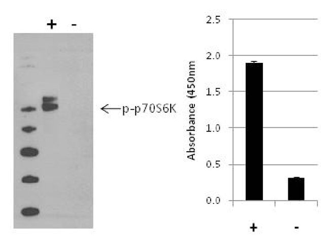 The InstantOne™ ELISA is specifically engineered for accurate measurement of phosphorylated human and mouse p70 S6K in cell lysates. Detection of rat p70 S6K is expected.The InstantOne™ ELISA kit allows for fast analysis of samples in approximately one hour. All reagents used in a traditional sandwich ELISA are added in solution to a plate followed by a wash step and detection with the TMB colorimetric substrate.The p70 S6 kinase (p70 Ribosomal Protein S6 Kinase, p70S6K) is a 70 kDa member of the ribosomal S6 kinase (RSK) family of serine/threonine kinases. p70 S6 kinase is predominantly localized in the cytoplasm, and is essential in growth factors regulated cell proliferation, pathways involving cell motility, such as metastases, the immune response, and tissue repair. p70 S6 kinase acts downstream of phosphoinositide (PI) 3-kinase, and its main physiological target is the S6 ribosomal protein, which is involved in upregulation of protein synthesis. The kinase activity of p70 S6 kinase leads to an increase in protein synthesis and cell proliferation. Amplification of the region of DNA encoding p70 S6 kinase and overexpression are seen in some breast cancer cell lines.