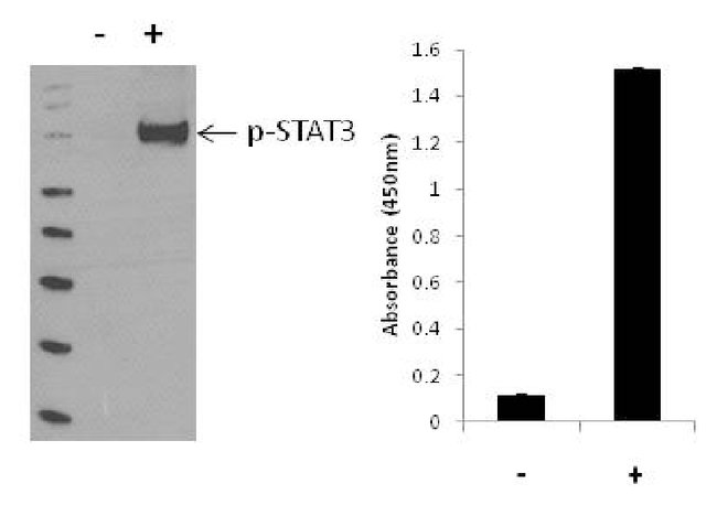 The InstantOne™ ELISA is specifically engineered for accurate measurement of phosphorylated human STAT3 in cell lysates. Detection of mouse and rat STAT3 is expected. The InstantOne™ ELISA kit allows for fast analysis of samples in approximately one hour. All reagents used in a traditional sandwich ELISA are added in solution to a plate followed by a wash step and detection with the TMB colorimetric substrate.STAT3 belongs to the family of STAT (signal transducers and activators of transcription) proteins which are phosphorylated by receptor associated kinases, translocate to the nucleus, and act as transcription factors in response to cytokines and growth factors. Coactivators such as CREB-binding protein are required for the transcriptional activation by STAT3. STAT3 can also be activated by Interferon-alpha, Interferon-gamma, EGF, PDGF and IL6. Phosphorylation on tyrosine 705 by JAK1 and JAK2 is essential for STAT3 dimer formation, nuclear translocation, and DNA binding activity. In humans, the STAT3 gene is located on the q arm of chromosome 17. STAT3 has been shown to be activated by IFN-alpha but not IFN-beta. The transcription factors associated with STAT3 are c-Jun and cyclic AMP-responsive enhancer binding protein (CREB). STAT3 mediates the expression of a variety of genes in response to cell stimuli, and thus plays a key role in many cellular processes such as cell growth and apoptosis. The small GTPase Rac1 has been shown to bind and regulate the activity of STAT3 while the PIAS3 protein is a specific inhibitor of STAT3. Three alternatively spliced transcript variants encoding distinct isoforms of STAT3 have been described. Deletion of the STAT3 gene in knock-out mice was lethal at the early embryonic stage.