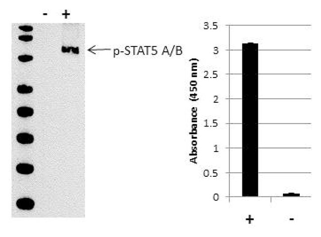 The InstantOne™ ELISA is specifically engineered for accurate measurement of phosphorylated human STAT5A/B in cell lysates. Detection of mouse and rat STAT5A/B is expected. The InstantOne™ ELISA kit allows for fast analysis of samples in approximately one hour. All reagents used in a traditional sandwich ELISA are added in solution to a plate followed by a wash step and detection with the TMB colorimetric substrate.Carries out a dual function: signal transduction and activation of transcription. Mediates cellular responses to the cytokine KITLG/SCF and other growth factors. Mediates cellular responses to ERBB4. May mediate cellular responses to activated FGFR1, FGFR2, FGFR3 and FGFR4. Binds to the GAS element and activates PRL-induced transcription. Regulates the expression of milk proteins during lactation.